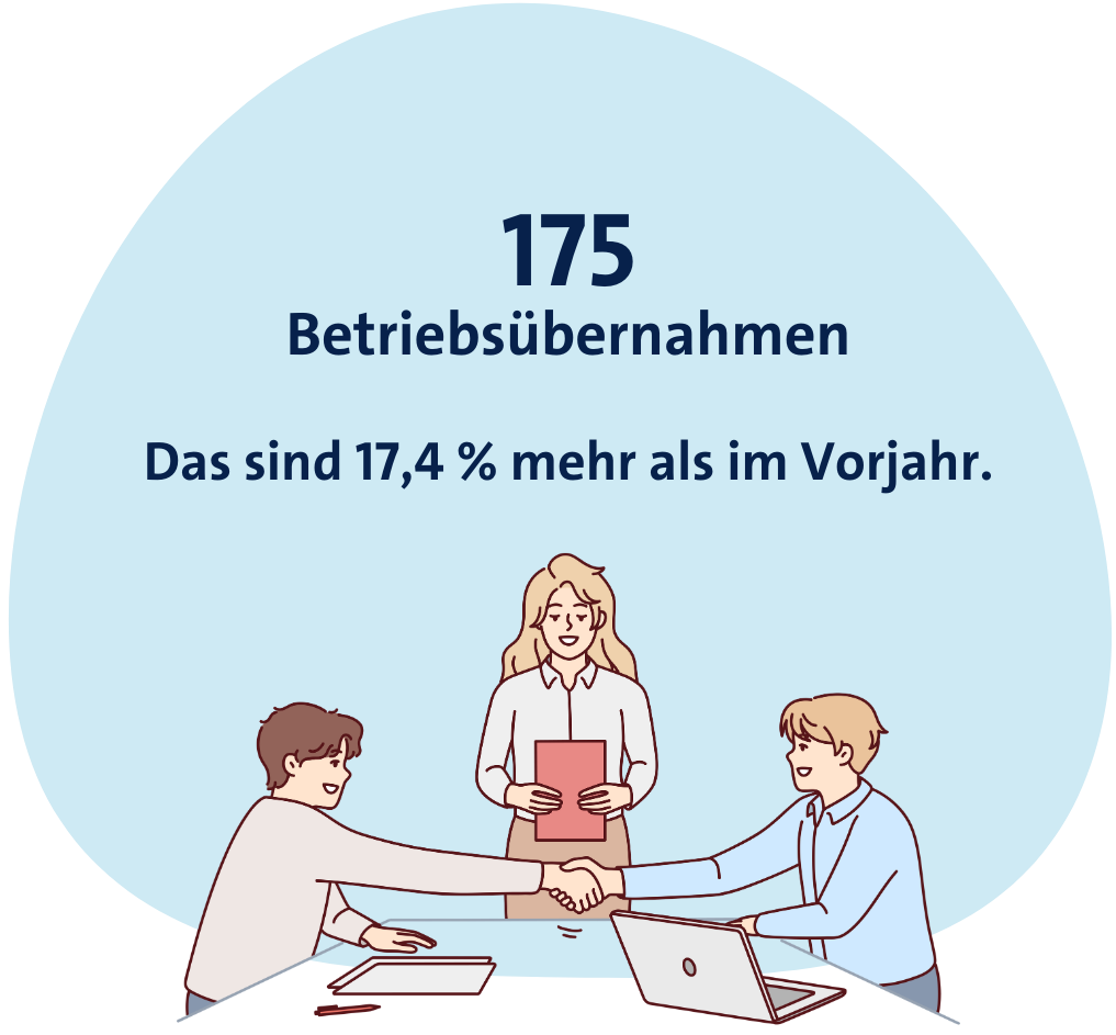 Das Gründungsgeschehen war im Vergleich zum Vorjahr geringer. Die Zahl der originären Neugründungen sank um 192 (-10,4 Prozent) auf 1.661. Gleichzeitig wurden 175 Betriebe übernommen; das sind +26 bzw. +17,4 Prozent mehr als im Vorjahr.