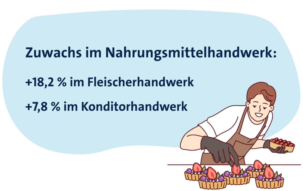 In den Nahrungsmittelhandwerken gab es Zuwächse bei Fleischern (+18,2 Prozent / +28 Betriebe) sowie bei Konditoren (+7,8 Prozent / +5 Betriebe). Als Treiber im Fleischerhandwerk wird weiterhin die Einführung der Eintragungspflicht von Fleischtheken im Lebensmitteleinzelhandel genannt.